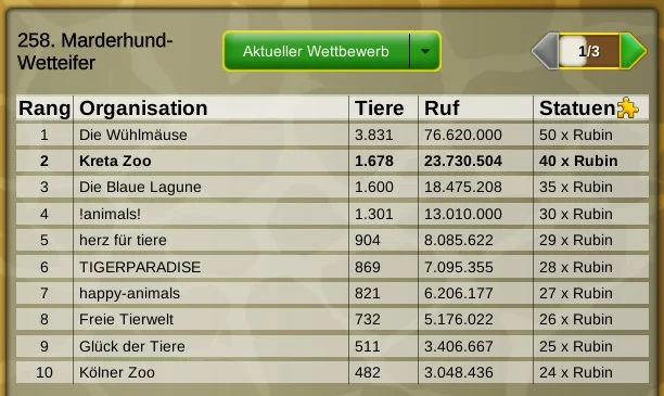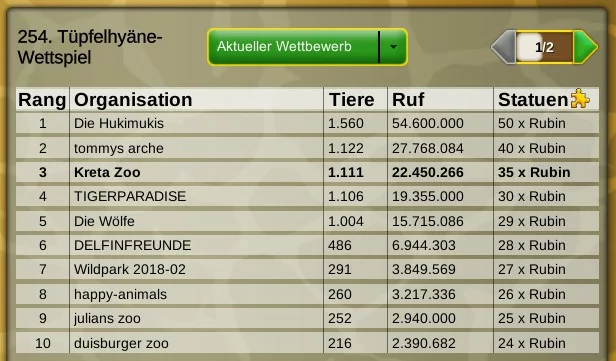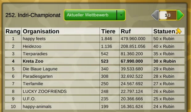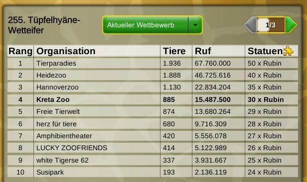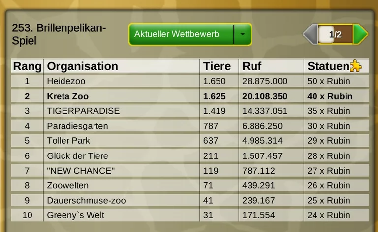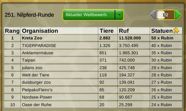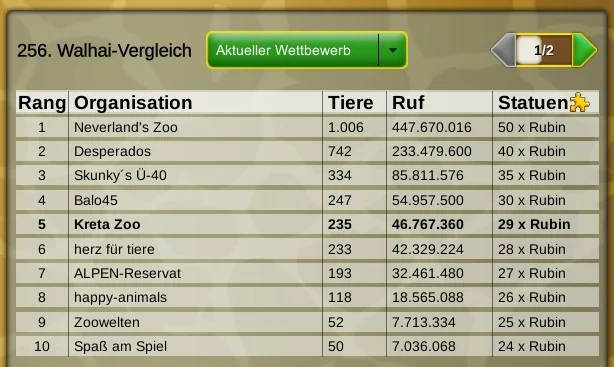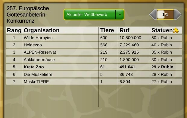 Eine komplette Statue kann sich jedes Orga-Mitglied dann in den Zoo stellen, die dann jeweils 10.000 Beliebtheit bei den Zoobesuchern generiert, somit mehr Besucher im Zoo anlockt und beim ersten Aufstellen der Statue einmalig 5.000EP aufs Konto bringt..