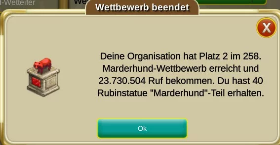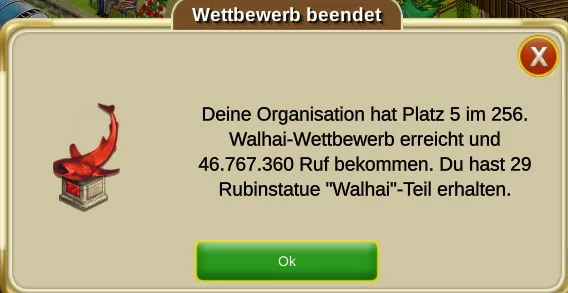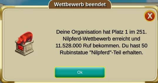 Als Gewinn gibt es Rufpunkte und Kartenteile für Rubinstatuen. Jede Rubinstatue besteht aus 50 Teilen. Der jeweils 1. Platz bekommt also 50 Teile, was einer kompletten Rubinstatue entspricht. Der 2. Platz erhält noch 40 Teile, der 3. Platz 35 Teile. Für den 4. Platz gibt es noch 30 Teile und danach wird bei jedem Platz schlechter, auch ein Teil abgezogen.